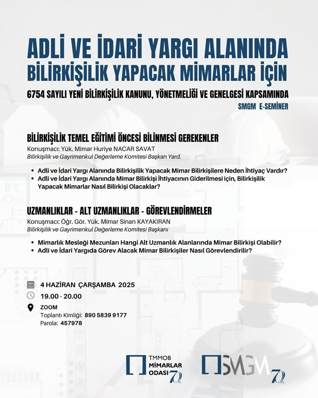 TMMOB Mimarlar Odası SMGM tarafından “ADLİ VE İDARİ YARGI ALANINDA BİLİRKİŞİLİK YAPACAK MİMARLAR İÇİN; 6754 SAYILI YENİ BİLİRKİŞİLİK KANUNU, YÖNETMELİK VE GENELGE KAPSAMINDA BİLGİLENDİRME” başlıklı seminer, Yük. Mimar Huriye Nacar SAVAT ve Öğr. Gör. Yük. Mimar Sinan KAYAKIRAN’ın sunumları ile 4 Haziran 2025 Çarşamba günü, saat 19.00’ da çevrim içi olarak gerçekleştirilecektir.