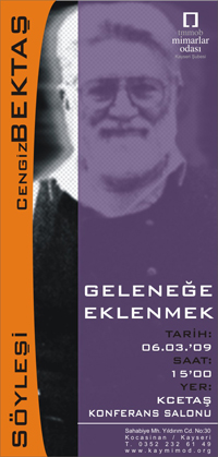 Mimarlar Odası Kayseri Şubesi, 6 Mart 2009 Cuma günü saat 15.00’da Kayseri KCETAŞ Konferans Salonu’nda Cengiz Bektaş’la “Geleneğe Eklenmek” başlığı altında bir söyleşi gerçekleştirecek.