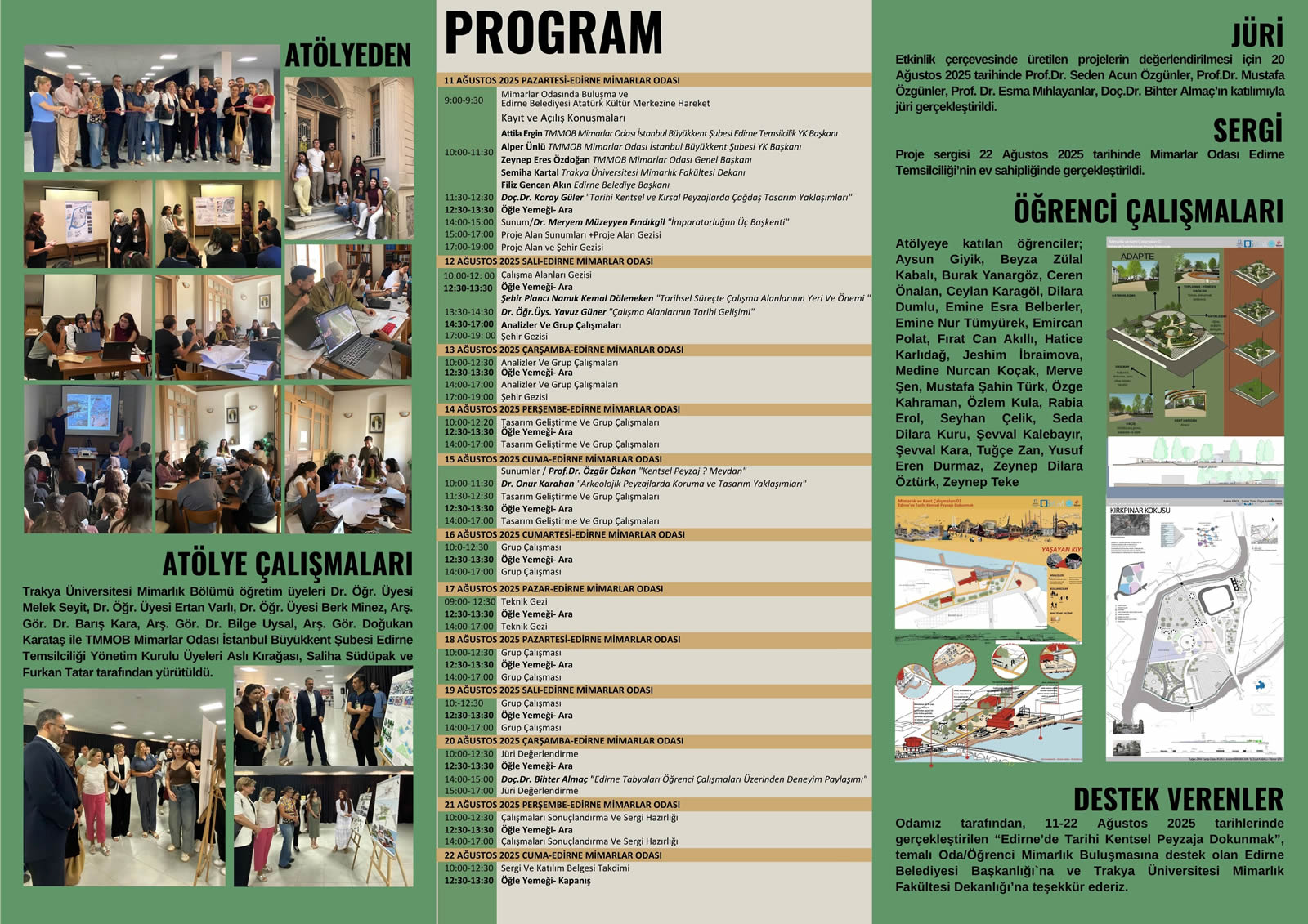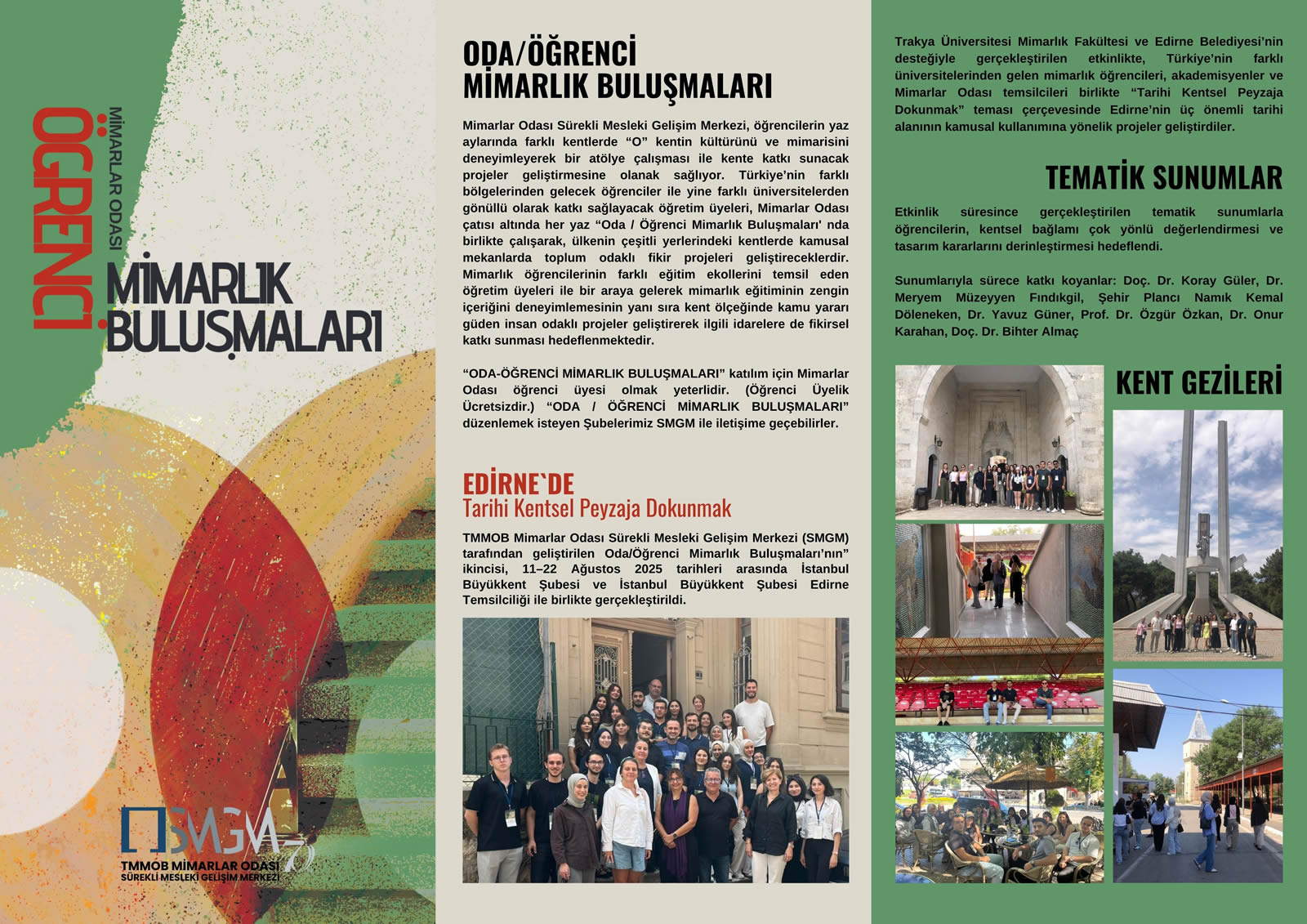 TMMOB Mimarlar Odası Sürekli Mesleki Gelişim Merkezi (SMGM) tarafından geliştirilen “Oda /Öğrenci Mimarlık Buluşmaları” programının ikincisi, 11–22 Ağustos 2025 tarihleri arasında, “Edirne’de Tarihi Kentsel Peyzaja Dokunmak” temasıyla, TMMOB Mimarlar Odası İstanbul Büyükkent Şubesi ve İstanbul Büyükkent Şubesi Edirne Temsilciliği ev sahipliğinde gerçekleştirilmiştir.