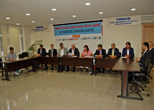 Cem Şahin (ÇMO), Yusuf Songül (GIDAMO), Harun Reşit Sever (HKMO), Hüseyin Tolga Koyuncugil (İÇMO), Nevzat Ersan (İMO), Hüseyin Alan (JMO), Halil Kavak (KMO), Can Doğan (MADENMO), Fikret Oğuz (MİMARLAR ODASI), Mehmet Çelik (PMO), Ayşegül Oruçkaptan (PEYZAJMO), Orhan Sarıaltun (ŞPO), Özden Güngör (ZMO)' ün katılımıyla gerçekleşen basın toplantısı metnini Makina Mühendisleri Odası Başkanı Ali Ekber Çakar okudu.