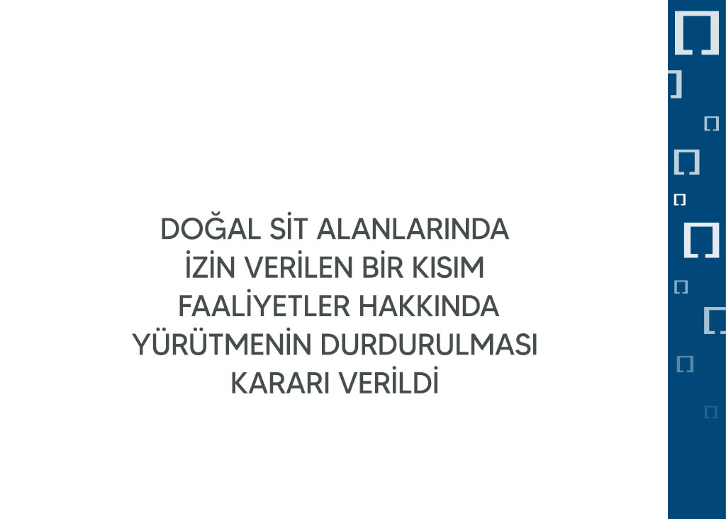 Danıştay İdari Dava Daireleri Kurulu taleplerimizin bir kısmını haklı bularak, hukuka uygun olmayan İlke Kararında nitelikli koruma alanlarında yapılabileceği öngörülen “iskele”, “balıkçı barınağı”, “bekçi kulübesi”, “B tipi mesire yerleri” ile atık su arıtma tesisi, atık su deşarjı, kanalizasyon şebekesi, içme suyu temini, jeotermal suyun çıkartılması ve iletim hattı, enerji nakil hattı, trafo, şalt sahası, iletişim hattı, ulaşım hattı, açık otopark, teleferik ve telesiyej gibi “zorunlu teknik altyapı uygulamaları”nın; bu faaliyetlere hangi ölçülerde izin verileceğine ilişkin açık bir düzenlemeye yer verilmediği, ayrıca "zorunlu" ifadesinin muğlak bir ifade olup belirsizlik yarattığı, “Nitelikli Doğal Koruma Alanları”nın doğal yapısının bozulmasına yol açabileceği, üst hukuk normlarına, koruma ilke ve esaslarına uyarlık bulunmadığı gerekçeleriyle yürütmesinin durdurulmasına karar vermiştir. Son günlerde Validebağ, Assos Limanı ve pek çok korunan alanda “teknik altyapı” çalışması adı altında yürütülen birtakım faaliyetlerin dayanağı olan ilke kararı hakkında verilen yürütmenin durdurulması kararı söz konusu uygulamaların da durdurulmasını gerektirmektedir.