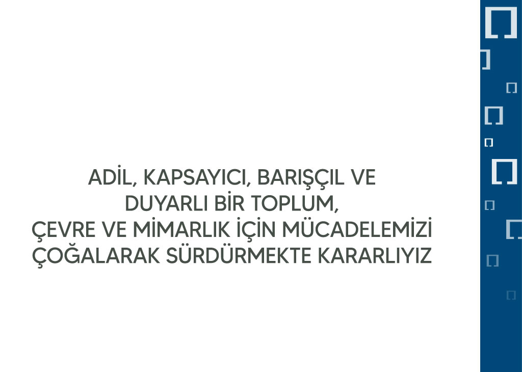 Kadınların iş hayatında yoğun şekilde yaşadıkları cinsiyete dayalı sosyal ve ekonomik ayırımcılığı, sosyal güvencesiz çalışma koşulları ile ötekileştirilme sorunlarını, kadın meslektaşlarımızın görünmez kılınma süreçlerini kınıyor, kadınların ürettiği doğaya ve topluma duyarlı, barışçıl, kapsayıcı ve nitelikli yapılı çevreleri kutlamaya, onurlandırmaya davet ediyor ve bu önemli alandaki mücadeleyi desteklemek için tüm duyarlı kesimleri, bileşenleri birlikteliğe ve dayanışmaya çağırıyoruz…