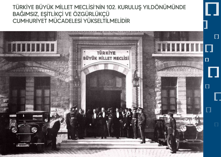 Gazi Mustafa Kemal Atatürk önderliğinde, egemenliğin kayıtsız şartsız ulusun olduğu bir yönetim anlayışı ile kurulan Türkiye Büyük Millet Meclisi'nin kuruluşunun 102. Yıldönümünde; halkın iradesi olan yasama yetkisi gasp edilmekte ve işlevsizleştirilmektedir. Cumhuriyetin eğitim, bilim, kültür, sanat, kentleşme ve diğer pek çok alandaki birikim ve kazanımlarını ortadan kaldırmaya yönelik adımlar atılmaktadır.