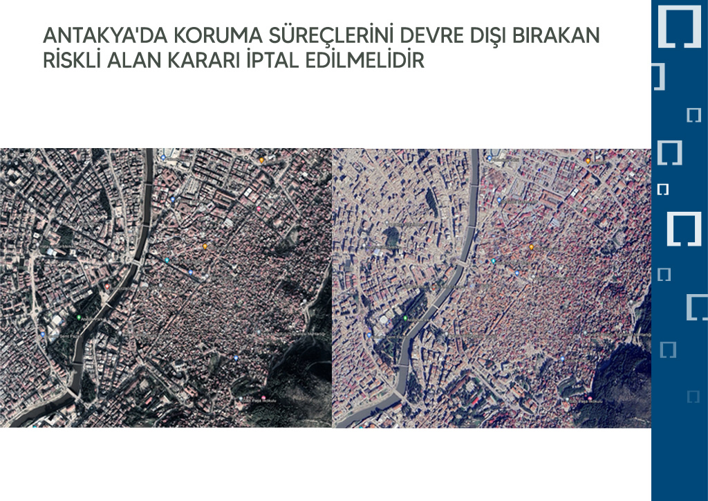 Antakya kent merkezi ve çevresi; tarihi, kültürel ve mimari birikimiyle evrensel bir öneme sahiptir. Bu alanın riskli alan uygulamasına konu edilmek yerine, korunması gerekmektedir.