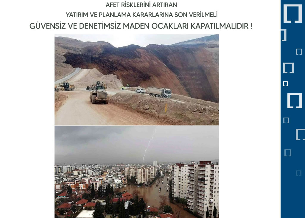 Afet risklerini artıran, rant odaklı çevre karşıtı yatırım ve planlama kararları ivedilikle durdurulmalı; güvensiz ve denetimsiz maden ocakları kapatılmalıdır. Bilimsel ilkeler ve gerçeklerle, kamu ve toplum yararı gözetilerek önlem alınmalı; bilim ve tekniğe aykırı işletme yöntemlerine dair kamu kurumlarının, kamu kurumu niteliğindeki meslek kuruluşlarının, bağımsız denetim kuruluşlarının görüş ve raporları dikkate alınmalıdır.