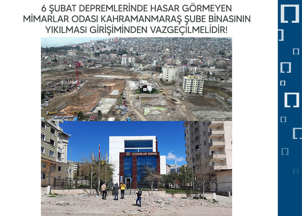 6306 Sayılı Afet Riski Altındaki Alanların Dönüştürülmesi Hakkında Kanunda getirilen değişiklikler, yeni kurulan Kentsel Dönüşüm Başkanlığı ve TOKİ eliyle yürütülen süreçte; Oda binamız bilimsel ilkeler ve gerçeklerle sunulan nitelikli mesleki hizmetlerin afetlere karşı güvence olduğunun kanıtıdır. Odamıza ve mimarlık meslek ortamına ait yapının yıkılması kabul edilemez, proje kapsamındaki uygulamalar ivedilikle durdurulmalıdır.