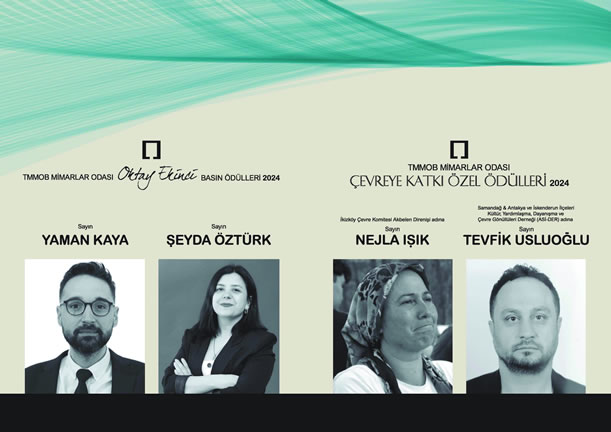 Bu dönem; Muğla İli Milas İlçesi’ne bağlı İkizköy Mahallesi’nde yer alan Akbelen Ormanı’nda yapılmak istenen termik santrallerin ve kömür madeni girişimlerine karşı aktif, özverili çabaları, yereli değerlendiren, toplumu aydınlatan katılımcı çalışmaları nedeniyle; İkizköy Çevre Komitesi Akbelen Direnişi adına İkizköy Muhtarı Nejla Işık ve çevre konularındaki araştırma ve çalışmaları, duyarlılıkları, Samandağ-Antakya-İskenderun bölgesindeki tarihi-kültürel değerleri koruma, özgürlük ve eşitlik ilkesiyle sosyal dayanışma mücadelesinde rol almaları ve 6 Şubat 2023 tarihinde meydana gelen depremlerde zarar gören Hatay’ın yeniden ayağa kaldırılması, kültürel kimliğinin ve kent dokusunun geleceğe taşınması konusundaki özverili çalışmaları nedeniyle Samandağ & Antakya ve İskenderun İlçeleri Kültür, Yardımlaşma, Dayanışma ve Çevre Gönüllüleri Derneği (ASİ-DER) adına Yönetim Kurulu Başkanı Tevfik Usluoğlu, Mimarlar Odası Merkez Yönetim Kurulu tarafından “Mimarlar Odası 2024 Çevreye Katkı Ödülü”ne layık görülmüştür.