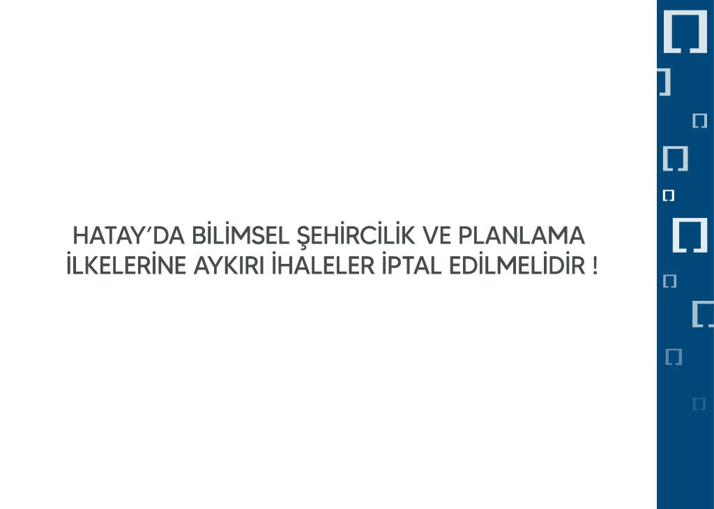 Hatay ve çevresinde ise süreç bilimsel planlama ilkelerine aykırı olarak yönetilmektedir. İlgili bakanlık, hiç de yabancı olmadığımız şirketlerden birinin vakfı üzerinden, pilot bölge adı altında küçük bir bölgede planlamayı başlatmış iken; Çevre, Şehircilik ve İklim Değişikliği Bakanından öğrendiğimiz üzere Hatay’ın tüm bölgelerinde 140.000 adet konut yapmak için 6 adet firma üzerinden, ihalesinin nasıl ve hangi şartlarla yapıldığı belli olmayan, adrese teslim yöntemlerle dağıtımı gerçekleştirilmiştir. Bu kapalı süreç kamuoyuyla bir başarıymış gibi paylaşılmıştır. Sürecin bilime ve tekniğe uygun yürütülmemesi ve olağanüstü koşullar nedeniyle daha önceleri kadük hale getirilmiş mevzuata dahi uygun yürütülmemesi, gelecekte Hataylıların yaşam kalitesi açısından başka sorunlar ortaya çıkaracaktır.