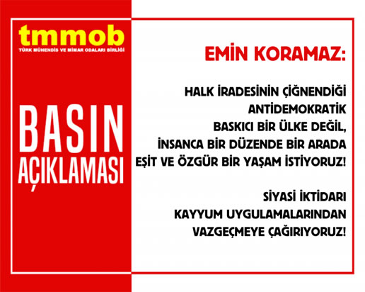 TMMOB olarak tarihimizin her döneminde antidemokratik ve baskıcı uygulamaların karşısında olduk. Bundan sonra da demokrasiden, özgürlüklerden, halkların kardeşliğinden ve barıştan yana tavrımızı sürdürmeye devam edeceğiz.