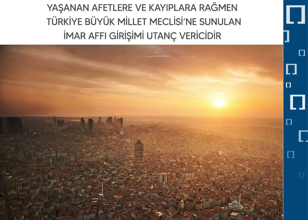 Yeni “İmar Affı” ile toplumun sağlığını ve can güvenliğini tehlikeye atan kentsel gelişmelere yol açacak, doğa olaylarının afete dönüşerek pek çok insanın hayatını kaybetmesine neden olacak popülist uygulamalar yeniden yürürlüğe sokulmak istenmektedir.