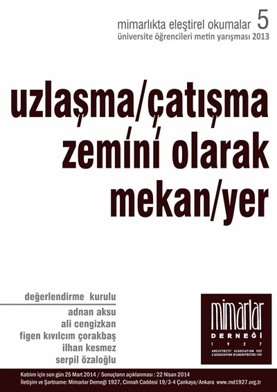 Mimarlar Derneği 1927'nin bu yıl 5. si düzenlenen ve teması "“Uzlaşma/Çatışma Zemini Olarak Mekan/Yer”" olan üniversite öğrencileri metin yarışmasının Şartnamesi için tıklayınız.